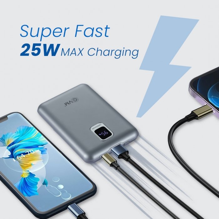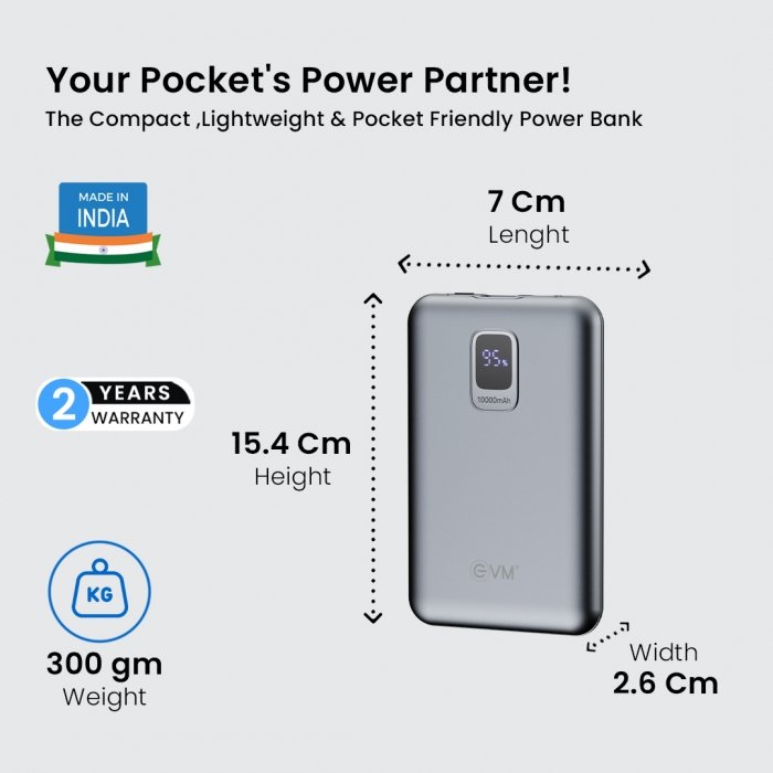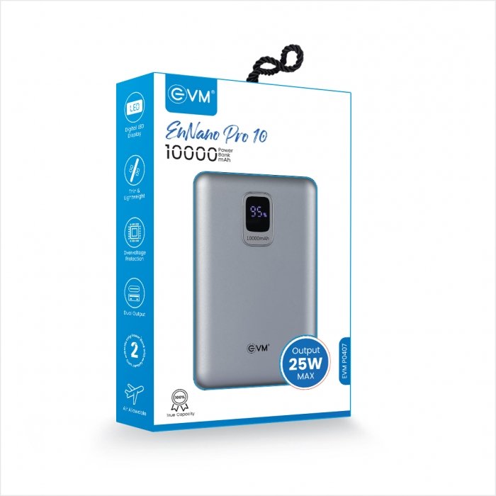 The EVM EnNano Pro 10 (P0407) is a compact 10,000mAh Lithium Polymer power bank featuring 25W fast charging, designed for portability and daily use. It offers dual-port output (USB and Type-C) to charge two devices simultaneously, supporting Android and iOS devices, and includes a 2-year warranty.