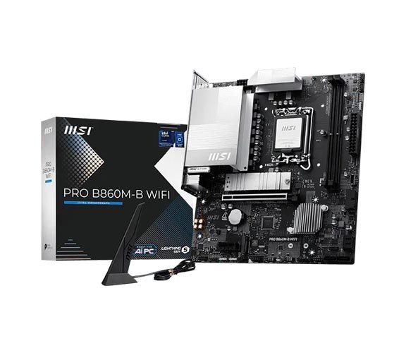 PRO B860M-B WIFI offers a simple design with a harmonious silver color scheme that perfectly matches both white and black PC builds. It is engineered with many exclusive features of MSI, a Wi-Fi 7 with EZ Antenna, 5G LAN, and PCIe 5.0 M.2, ready for the Intel® Core™ Ultra processors.